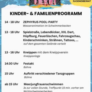 Das Event beginnt bereits um 13 Uhr mit der Zephyrus Pool Party – einer actionreichen Wasseranimation für die Kleinen im und am Schwimmerbecken des Erlebnisbads. Im Nichtschwimmerbecken steht ein Meerjungfrauenschwimmen auf dem Programm. Darüber hinaus können sich die Kids unter anderem auf der Hüpfburg oder beim Lebendkicker austoben und beim Feuerlöschen oder Kinderschminken mitmachen. In der Kneippanlage des Erlebnisbads gibt der Schwandorfer Kneippverein eine kostenlose Einführung in die Lehren Sebastian Kneipps, auf der Bühne treten verschiedene Tanzgruppen aus dem Stadtgebiet auf und über das gesamte Gelände verteilt bieten Schwandorfer Vereine und Institutionen zahlreiche Mitmach-Aktionen an. Für das leibliche Wohl ist an verschiedenen Foodtrucks und Bars ebenfalls bestens gesorgt.