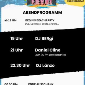 Ab 19:00 Uhr verwandelt sich das Erlebnisbad dann in eine stimmungsvolle Beachparty –. Mit Beats von DJ BERgi, Daniel Cline und DJ Länzo wird auf dem Beachvolleyballfeld bis in die Nacht gefeiert.