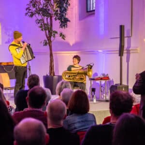 Pünktlich zum Ende der Winterzeit beschließen wir die Konzertreihe mit einem ganz besonderen Duo. Maxi Pongratz (Akkordeon) ist bekannt durch seine Band Kofelgschroa und war zuletzt unterwegs mit Micha Acher von „The Notwist“. Jetzt kommt er mit Theresa Loibl an der Tuba nach Schwandorf. Und die beiden haben Maxis neues Album „Meine Ängste“ dabei. Die Lieder beschäftigen sich mit der selten ordentlichen, häufiger chaotischen Frage danach, wer man eigentlich ist – oder zumindest sein will – ganz nach dem Motto: » I bin geboren und ko mi gar ned erinnern, dass mi irgendwer gefragt hat, ob I gern geboren werden dad « – so ist das mit dem Leben. Wir werden hineingeworfen und müssen dann irgendwie damit klarkommen. Was für ein Glück für uns, dass bei diesem Duo immer wieder das Leichte und verspielte um die Ecke biegt und dem Schweren ein wenig Platz stiehlt.