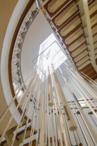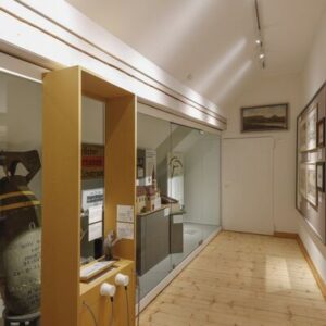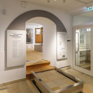 In das Obergeschoß kann man mit Hilfe eines Aufzugs gelangen. Dort sind alle Räume und Ausstellungsbereiche gut erfahrbar. Hier wurde eine großzügige Rampe eingebaut, die durch einen großen Teil der neuen Dauerausstellung führt.